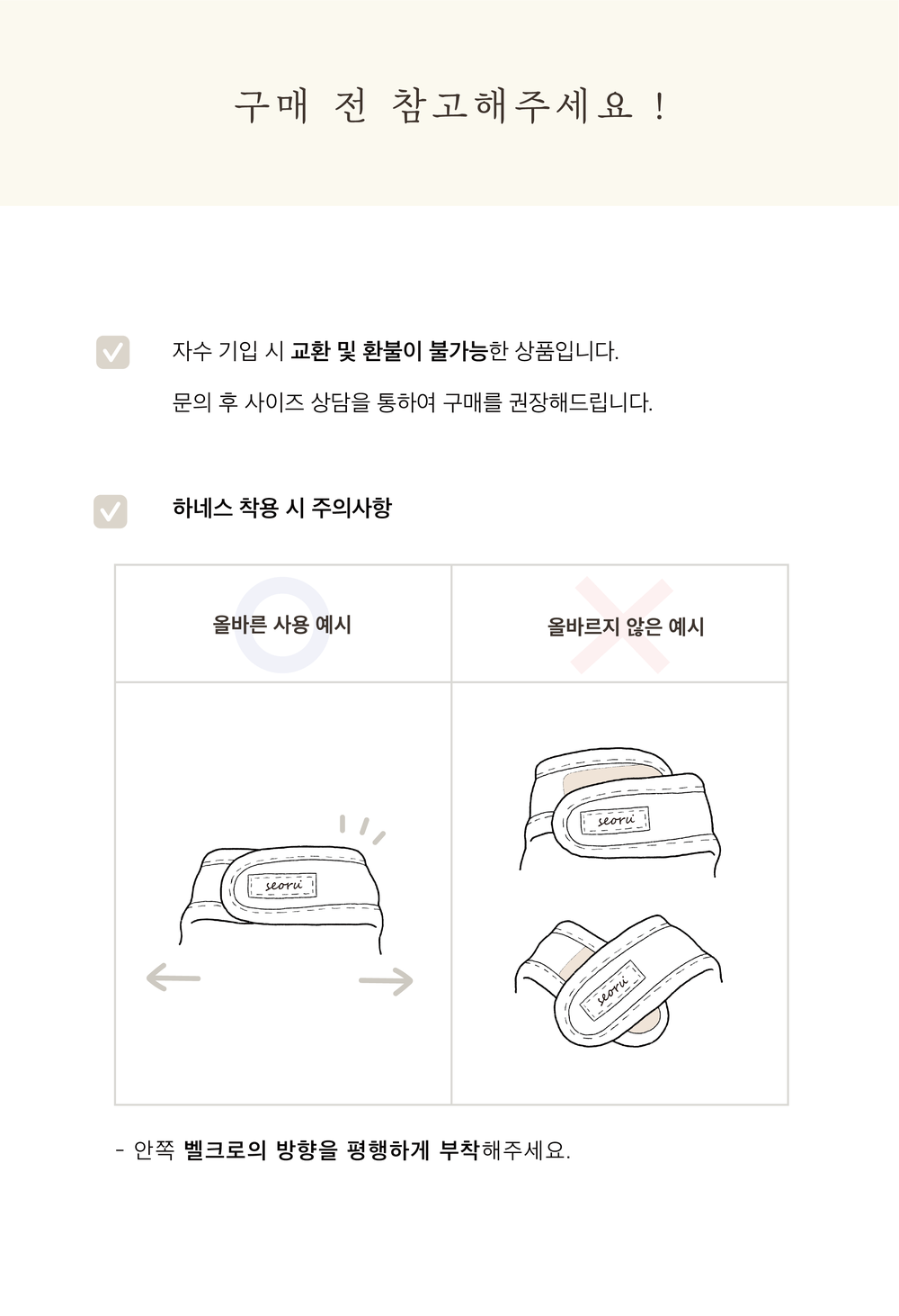 겉감에는 통기성이 매우 좋고 부드러운 거즈 원단을, 안감에는 린넨과 면이 혼방되어 통기성이 좋으며 세탁 후에도 변형이 적은 원단을 골라 사용하였습니다. 또한 로하스 인증을 받은 튼튼한 벨크로를 사용하여 아이들의 나가는 힘에 뜯기지 않는 강력한 견고함을 더해 안전을 최우선으로 생각했습니다.