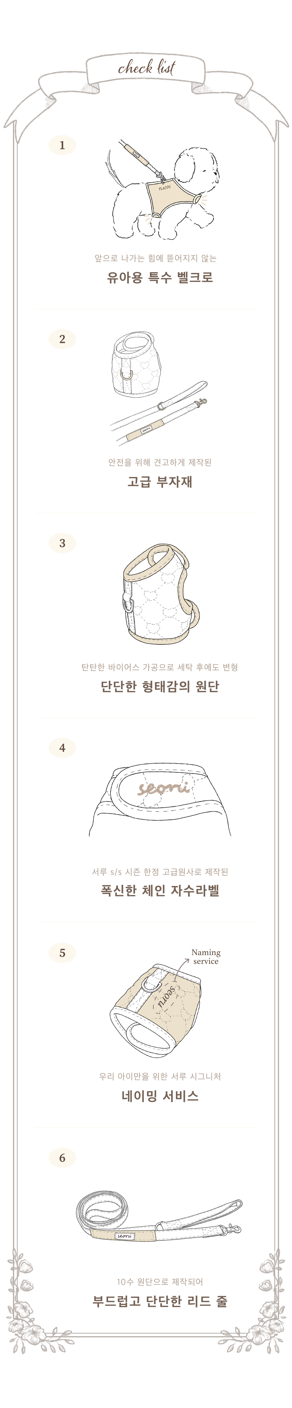 사랑스러운 하트 누빔이 돋보이는 서루의 22s/s bloom harness 라인을 소개합니다. 발랄한 색을 담은 빈티지 플라워 원단을 하트 모양 누빔패턴으로 제작하여 봄의 러블리함이 느껴지는 하네스입니다. 하네스와 세트 구성인 리드줄에는 하네스와 동일한 원단을 조각내 덧붙혀 맞춘 멋스러움이 있습니다.
