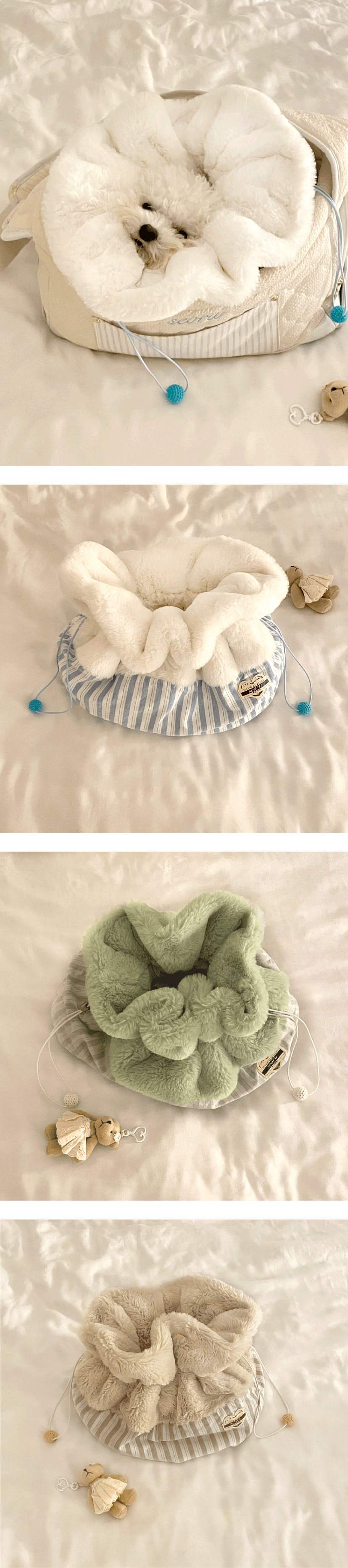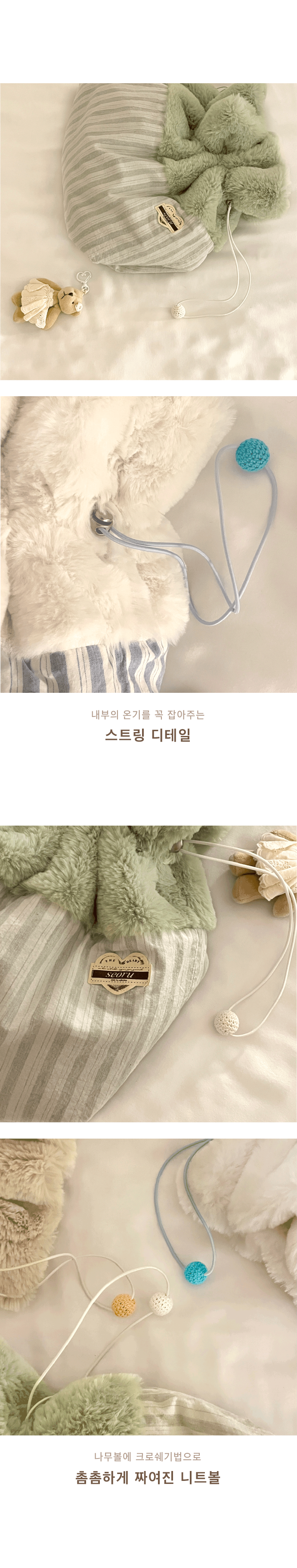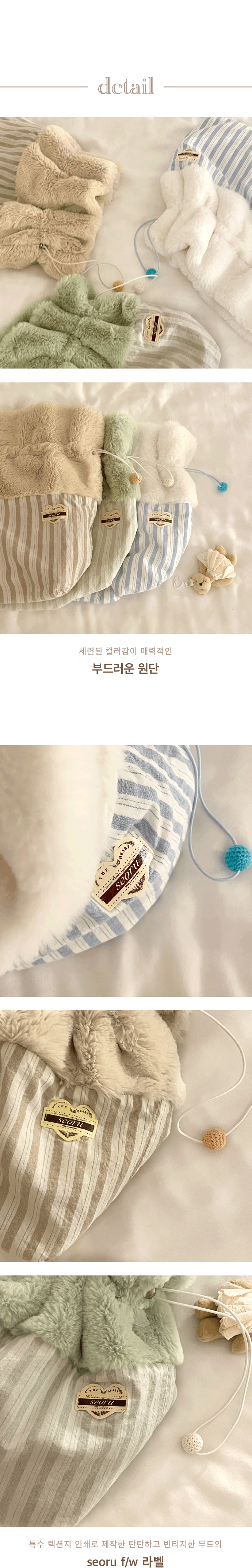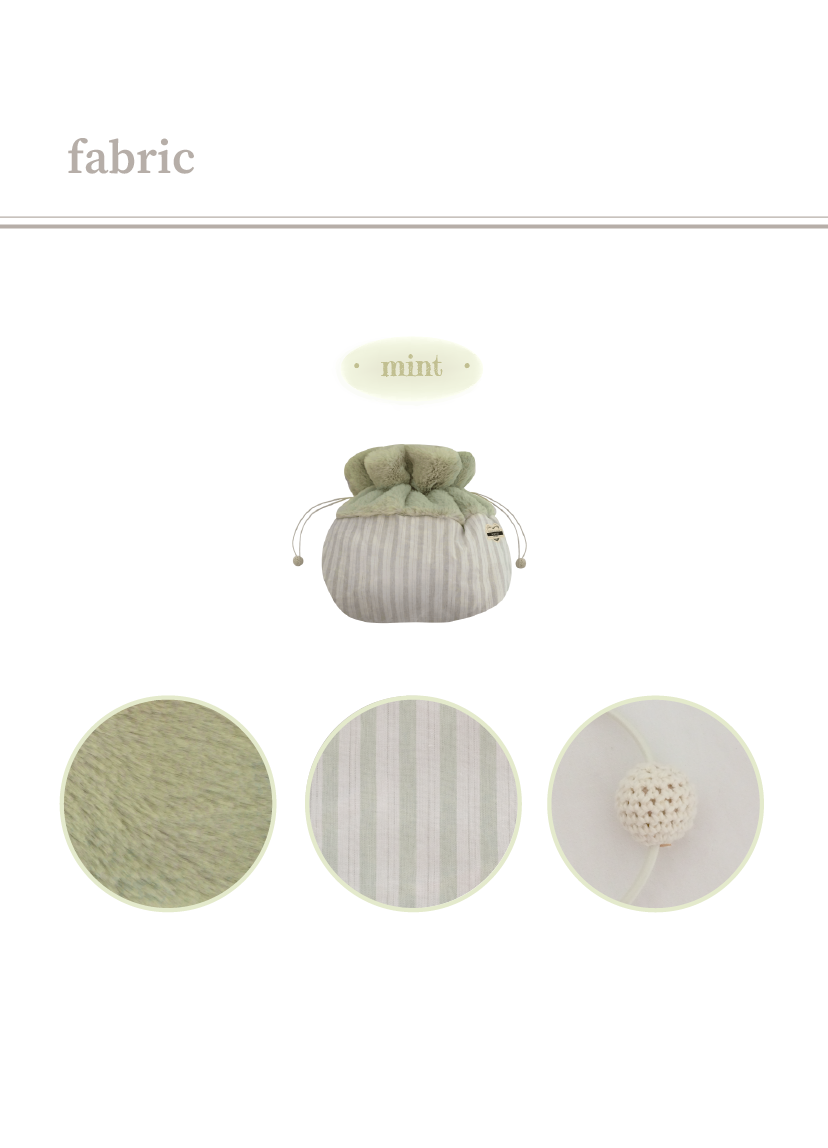 부쩍 쌀쌀하진 찬 공기로부터 아이들을 따듯하게 보호해주는 f/w시즌 스테디셀러, 리뉴얼된 프렌치 꿀단지(French Honey Pot)를 소개합니다. 풍성한 15mm의 고급 퍼 원단과, 무명실로 짠 100% 코튼 원단을 사용하여 가벼우면서도 따듯함을 더했습니다. 특히 허니팟 내부의 아이들 몸을 감싸는 모든 부분을 고품질의 fur원단으로 제작하여 아이들이 더욱 포근하고 따듯하게 머물 수 있어 좋습니다. 또한, 스트링 조절 디테일로 따듯한 온기를 보다 오랫동안 내부에 머금을 수 있도록 했으며 스트링 끝 부분에는 작은 나무공에 수작업인 크로셰 기법으로 털실을 짜 장식한 컬러 우드볼로 산뜻한 포인트를 주었습니다. 꿀단지는 슬링백, 베루백, 발롱백과 같이 사용할 때에 2중으로 아이들을 두텁게 보호해 찬 기운을 막아주며 가방 밖 공간에서도 다양한 상황에 활용 가능합니다. 포근하게 겨울을 같이 할 프렌치 꿀단지는 세 가지 색상(mint, beige, blue)으로 만나보실 수 있습니다.
