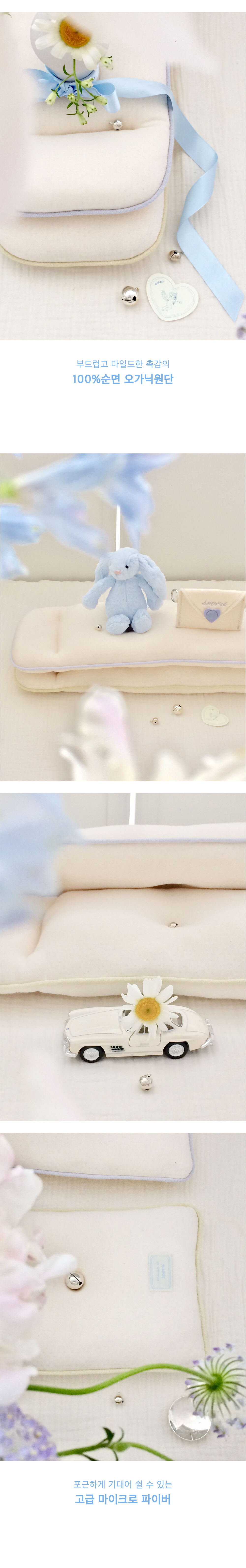 포근하고 부드러운 감촉이 느껴지는 organic 베루백 쿠션입니다. 오가닉 베루백 쿠션은 친환경 공법으로 제작된 오가닉 유아용 원단을 사용하여 아이들이 얼굴을 맞대고 쉴 때에도 보드라움을 느낄 수 있도록 제작하였으며 내부는 micro fiber100%로 충전해 아이들이 모찌떡같은 쫀득함을 느끼며 머무를 수 있습니다. 또한 촘촘하게 짜여진 세밀하고 작은 꽃무늬 펀칭조직은 쿠션 내부의 공기순환을 도와 통기성에 매우 좋습니다. 다양한 컬러의 파이핑 디테일로 제작된 오가닉 베루백 쿠션은 스트라이프(pink, mint, blue)와 솔리드(blue, lemon cream) 5가지의 컬러스타일로 골라보실 수 있습니다.