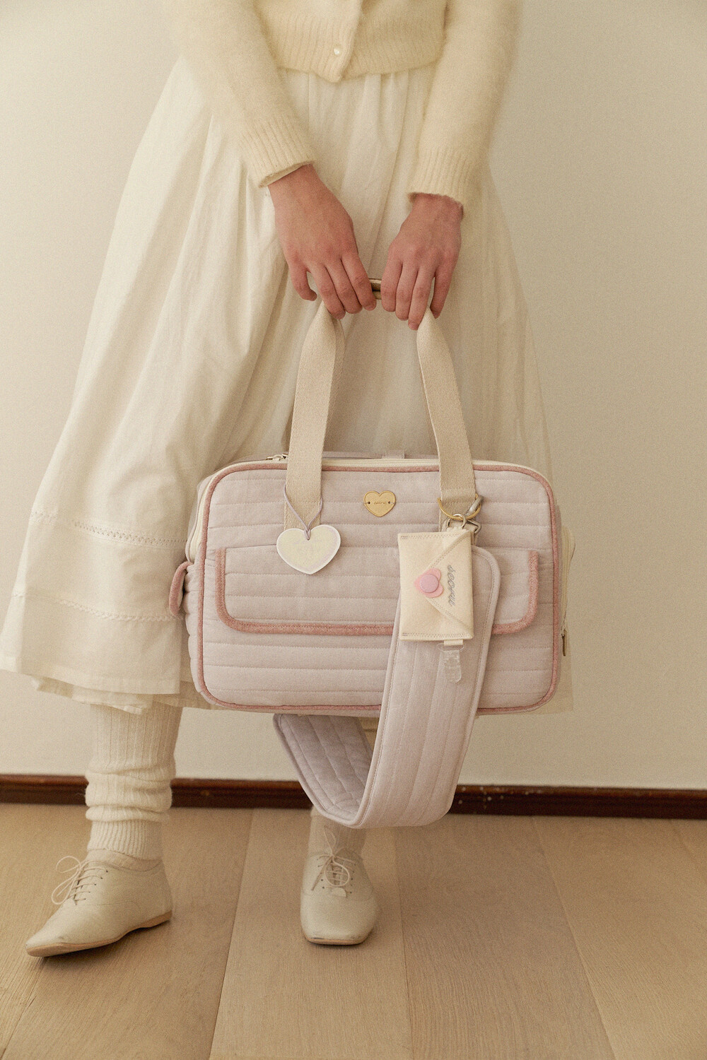 고급스러운 브리티쉬 무드의 클래식함으로 오랜 시간 함께하시기 좋은 헤리티지 발롱백(Heritage Ballon bag)입니다. 헤리티지 발롱백은 영국 MOON사의 레이디웨어 헤리티지 컬렉션 원단을 포인트 디테일로 삼아 메인포켓과 사이드포켓, 가방 전체의 테두리를 장식해 제작하였으며 골드컬러의 고급 부자재를 곳곳에 사용하여 멋스러움을 더했습니다. 메인 겉감 원단에는 cotton100%을 바이오 워싱 처리해 오묘한 컬러감이 매력적인 누빔 원단을 사용하고, 내부 안감에는 촘촘한 조직감의 부드러운 방수원단을 사용하여 아이들이 청결한 환경에서 포근하게 쉴 수 있는 것을 염두에 두었습니다. 내부 공간을 이루는 모든면에는 폭신하지만 단단한 보강재를 덧대어 제작해 아이들이 안정감을 느끼며 기대어 휴식을 취할 수 있는 편안한 보금자리를 만들고자 하였으며 보호자분들의 장시간 사용에도 부담스럽지 않도록 22f/w 이후의 모든 발롱백 크로스 스트랩에 더욱 도톰한 15T 두께의 폭신한 스폰지를 넣어 제작했습니다. “All the love” (모든 사랑을 담아), 이곳저곳 크고 작은 하트쉐입이 숨겨져 있는 헤리티지 발롱백은 2가지 컬러(Lavender, Sand beige)로 출시되었습니다. 오랫동안 함께할 수 있는 근사한 공간, 헤리티지 발롱백을 통해 아이들과의 멋진 일기를 쌓아나가보세요.