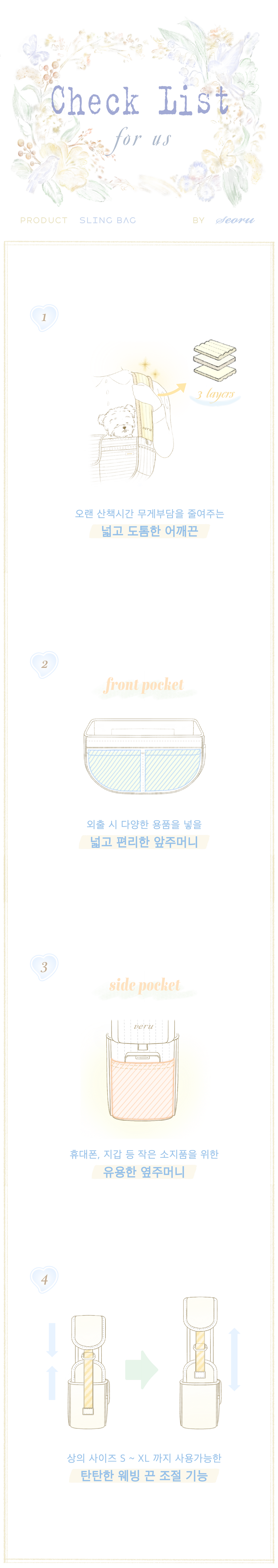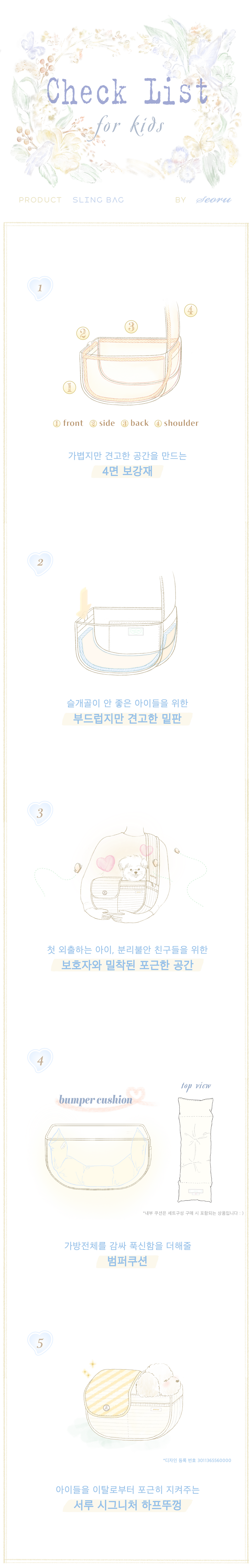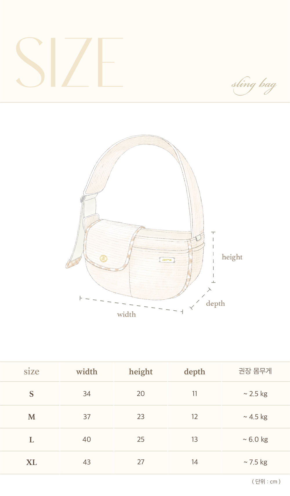 하프 뚜껑이 아이들의 몸을 감싸주어 더욱 안정감 있는, 아이들이 얼굴만 쏙 빼어 보호자님과 교감할 수 있는, 서루의 스테디셀러 클래식 셸 슬링백(Classic Shell Sling bag)의 24f/w시즌 새로 출시되는 서루펫백입니다. 하프 뚜껑이 있는 오랜 서루의 오리지널 슬링백으로 슬링백 라인업 중 가장 가벼워 휴대성이 좋으며 외출 시 데일리하고 편하게 사용하실 수 있습니다.가방의 모든 벽면과 어깨패드에는 부드럽지만 단단한 보강재를 넣어 제작하였으며, 모든 파이핑 마감과 웨빙에 끝처리에는 일본 SHIBAYA사 (베이지)/ SHAMBRAY사(블랙)의 고밀도 원단을 넣어 귀여운 포인트를 느끼실 수 있습니다.