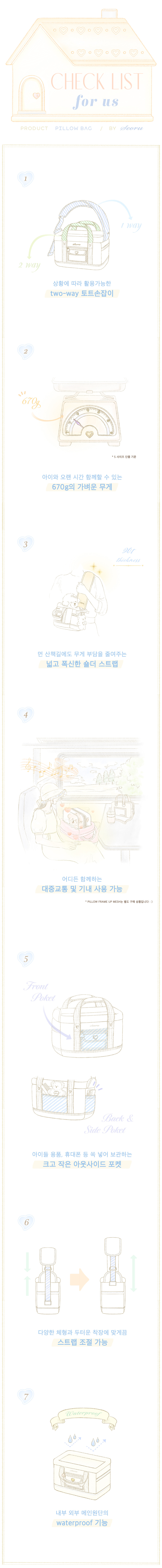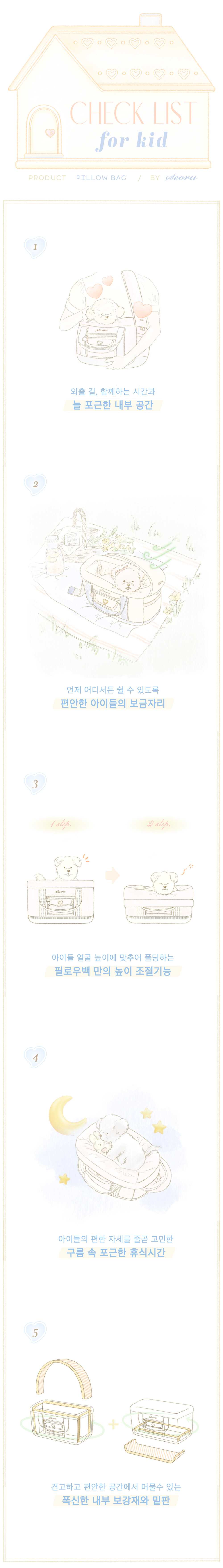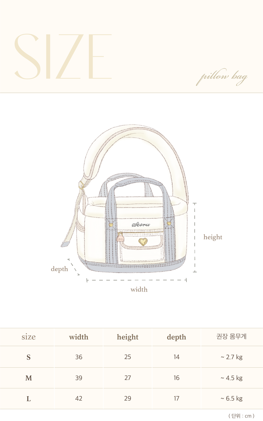 수많은 샘플링을 거쳐 완성된 서루의 첫 번째 쿠션형 슬링백, 필로우백(Pillow Bag)을 소개합니다. 베개처럼 포근한 보금자리 같은 필로우백은 아이들이 외출 시 어디서든 베개 같은 폭신함을 느끼며 휴식할 수 있음을 기획하여 쿠션형 슬링백으로 제작되었습니다. 보다 여유로운 폭과 푹신한 공간감이 특징인 필로우백은 레터백과 같은 방식으로 가방의 윗면을 부드럽게 접어 줄 수 있어 아이들이 쉽게 기대어 휴식할 수 있으며, 상황에 맞춘 폴딩으로 아이들이 시원한 개방감을 느낄 수 있어 좋습니다. 또한 도톰한 어깨스트랩과, 세심하게 박음질한 스티치가 돋보이는 견고한 손잡이를 2-way로 사용하실 수 있어 보호자분들께서 상황에 따라 활용도 높게 사용하실 수 있습니다. 필로우백을 채운 모든 솜은 부드러운 100% 마이크로화이바와 오래 사용이 가능한 촘촘한 밀도의 고급 솜을 사용했습니다. 필로우백은 세련된 디자인의 (navy, beige) 두 가지 컬러로 만나보실 수 있습니다.