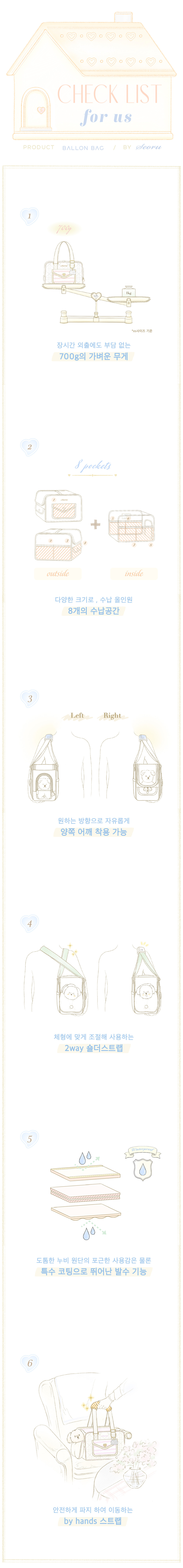 둥글둥글한 귀여운 하트잠금장치가 있는 프론트 포켓과 더불어, 널찍한 7곳의 수납공간으로 많은 아이들 용품을 발롱백만으로 올인원 수납해 외출이 가능해 좋습니다. 또한 발롱백 쿠션은 마이크로 화이바100%로 충진하고, 천연 오가닉 원단을 사용하여 아이들이 포근하게 휴식할 수 있음을 생각했습니다. 엣지코트 마감을 통한 수작업으로 정성스럽게 만든 실버 하우스 팬던트가 외출길 포인트가 되어주는 하우스 발롱백은 세련된 두 가지 컬러로 (Black / Pink) 출시되었습니다.