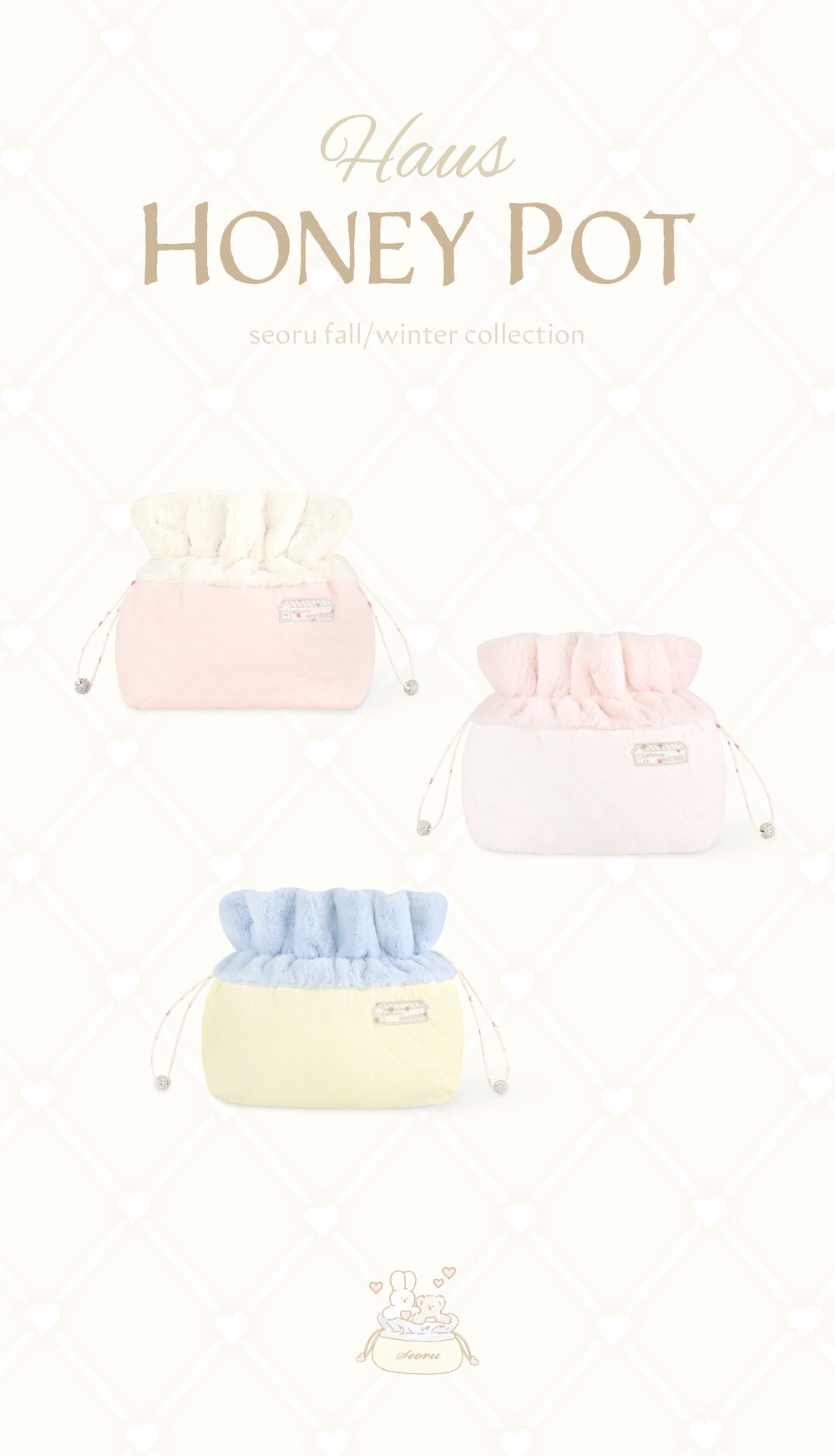 서루가 좋아하는 색감을 위해 자체제작한, 더욱 도톰해진 열풍원단, 플라위 패턴 스트링과 수공예 실버볼 디테일이 예쁜 서루의 f/w시즌 스테디셀러, 하우스 허니팟 (haus honey pot)입니다. 부쩍 쌀쌀하진 찬 공기로부터 아이들을 따듯하게 보호해 주는 하우스 허니팟은 풍성한 15mm의 고급 퍼 원단과, 무명실로 짠 100% 코튼 원단을 사용하여 가벼우면서도 따듯함을 가지고 있는 것이 특징입니다. 특히 허니팟 내부의 아이들 몸을 감싸는 모든 부분을 고품질의 퍼원단으로 제작하여 아이들이 더욱 포근하고 따듯하게 머물 수 있어 좋습니다. 또한, 탄성이 적어 더욱 견고해진 스트링 조절 디테일로 따듯한 온기를 보다 오랫동안 내부에 머금을 수 있도록 했으며 스트링 끝 부분에는 수공예로 정성스럽게 작업한 실버볼 디테일이 장식되어 있습니다. 꿀단지는 서루의 가방 라인과 같이 사용할 때에 2중으로 아이들을 두텁게 보호해 찬 기운을 막아주며 가방 밖 공간에서도 다양한 상황에 활용 가능합니다. 포근하게 아이들과 함께 할 하우스 꿀단지는 세 가지 색상(white, pink, blue)으로 만나보실 수 있습니다.