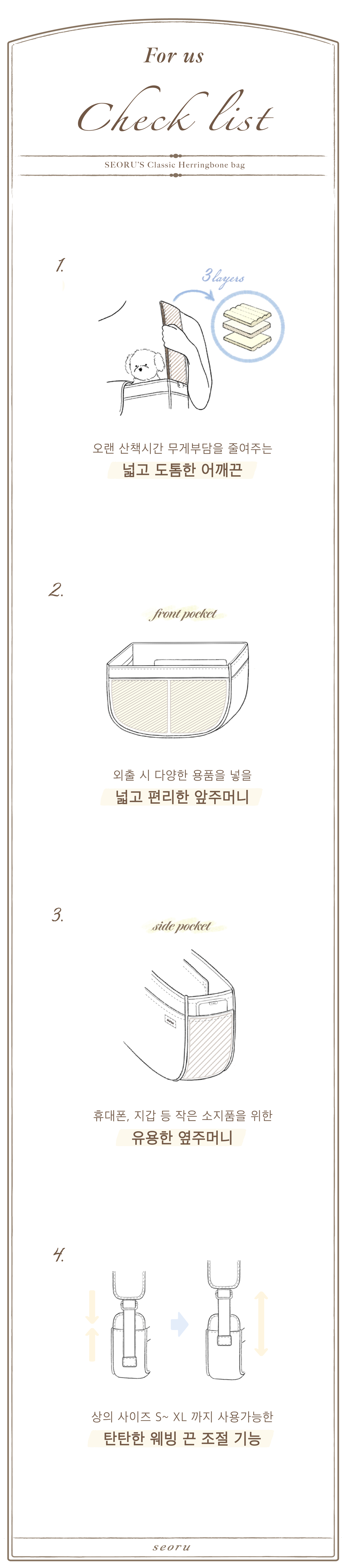 ✔︎서루의 시그니쳐 상품인 헤링본펫백은 앞,뒷면과 어깨끈 부분의 스폰지 보강재 추가로 리뉴얼되었습니다. 리뉴얼로 인해 더욱 탄탄하고 폭신한 사용감을 느끼실 수 있습니다.