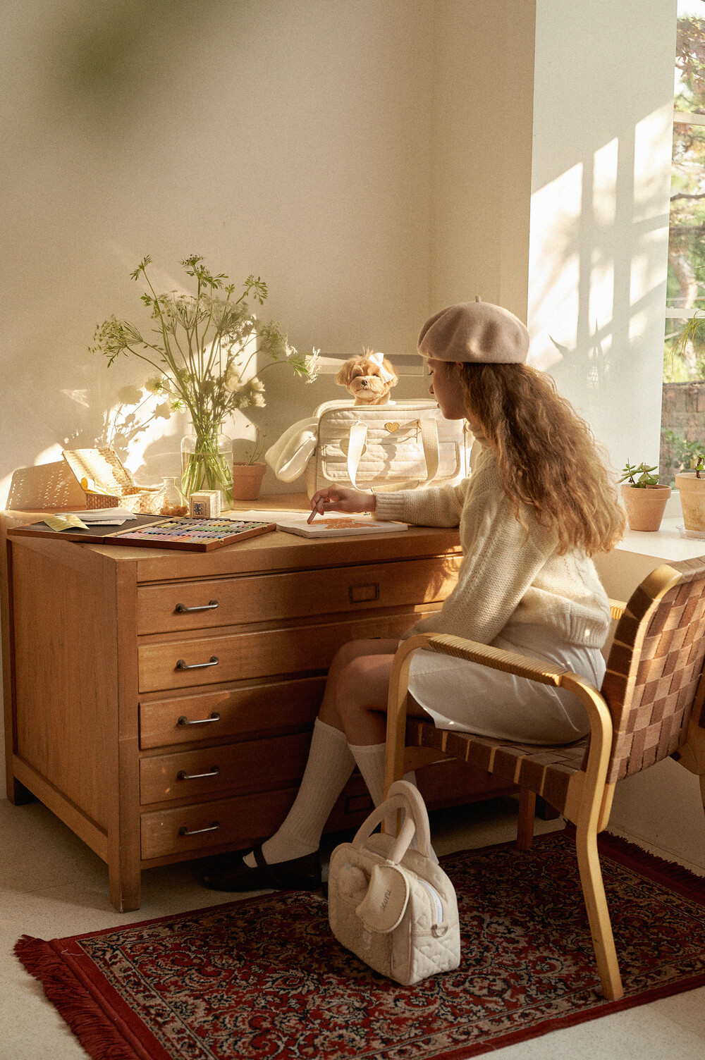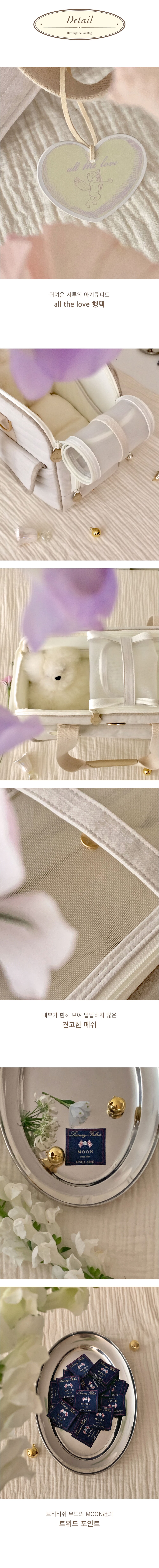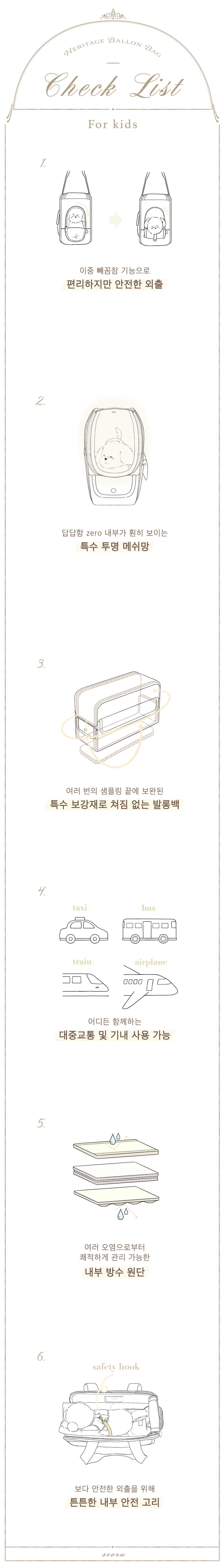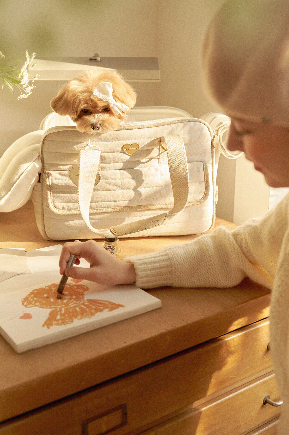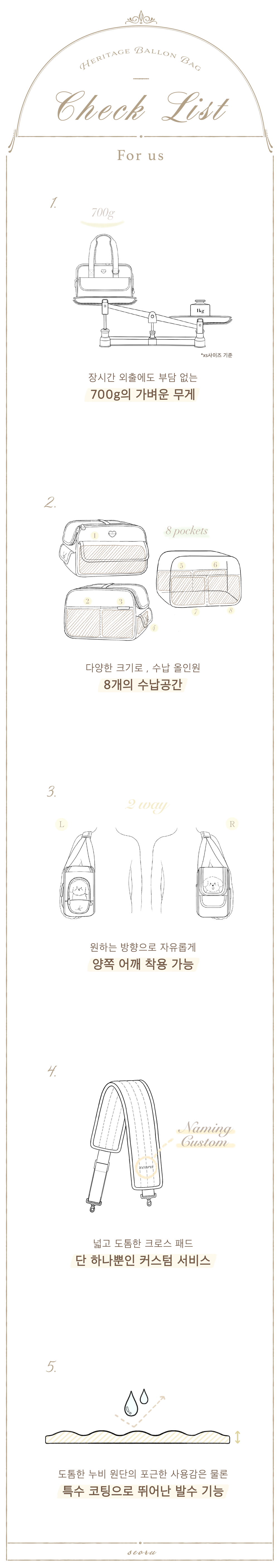 고급스러운 브리티쉬 무드의 클래식함으로 오랜 시간 함께하시기 좋은 헤리티지 발롱백(Heritage Ballon bag)입니다. 헤리티지 발롱백은 영국 MOON사의 레이디웨어 헤리티지 컬렉션 원단을 포인트 디테일로 삼아 메인포켓과 사이드포켓, 가방 전체의 테두리를 장식해 제작하였으며 골드컬러의 고급 부자재를 곳곳에 사용하여 멋스러움을 더했습니다. 메인 겉감 원단에는 cotton100%을 바이오 워싱 처리해 오묘한 컬러감이 매력적인 누빔 원단을 사용하고, 내부 안감에는 촘촘한 조직감의 부드러운 방수원단을 사용하여 아이들이 청결한 환경에서 포근하게 쉴 수 있는 것을 염두에 두었습니다. 내부 공간을 이루는 모든면에는 폭신하지만 단단한 보강재를 덧대어 제작해 아이들이 안정감을 느끼며 기대어 휴식을 취할 수 있는 편안한 보금자리를 만들고자 하였으며 보호자분들의 장시간 사용에도 부담스럽지 않도록 22f/w 이후의 모든 발롱백 크로스 스트랩에 더욱 도톰한 15T 두께의 폭신한 스폰지를 넣어 제작했습니다. “All the love” (모든 사랑을 담아), 이곳저곳 크고 작은 하트쉐입이 숨겨져 있는 헤리티지 발롱백은 2가지 컬러(Lavender, Sand beige)로 출시되었습니다. 오랫동안 함께할 수 있는 근사한 공간, 헤리티지 발롱백을 통해 아이들과의 멋진 일기를 쌓아나가보세요.