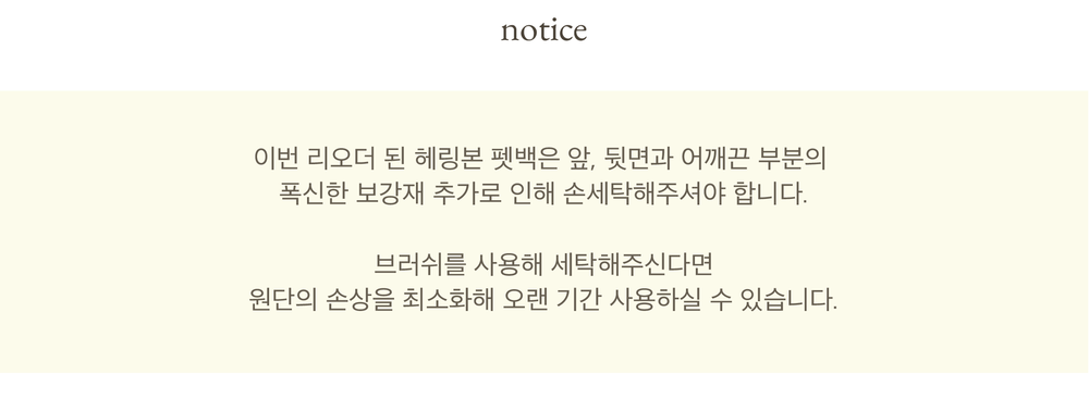 꾸준하게 사랑받아온 기존 헤링본 펫백에 디테일을 더해 베이직한 요소들의 탄탄한 완성에 중점을 두었으며 어떠한 룩에도 조화로운 포인트가 될 수 있는 미니멀한 라인입니다.