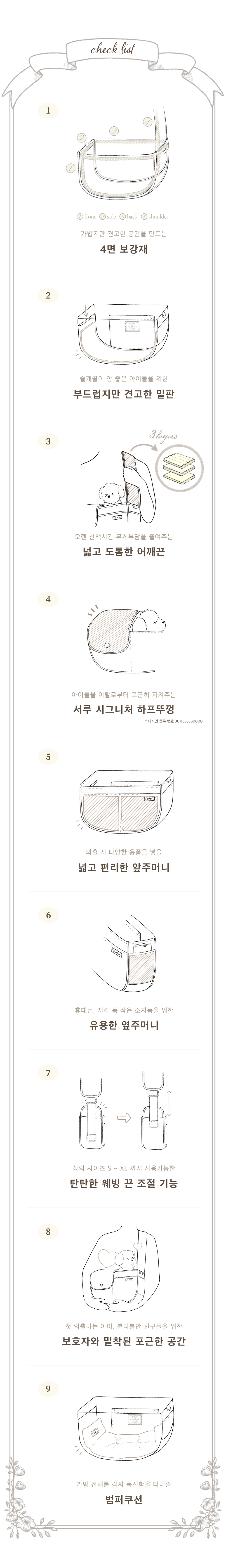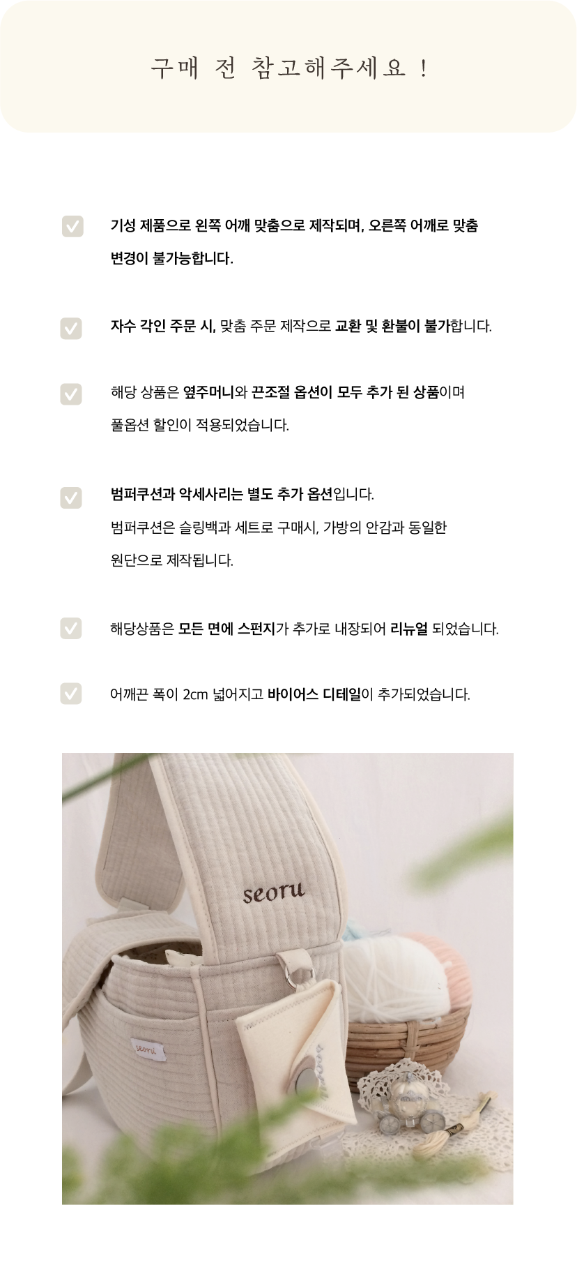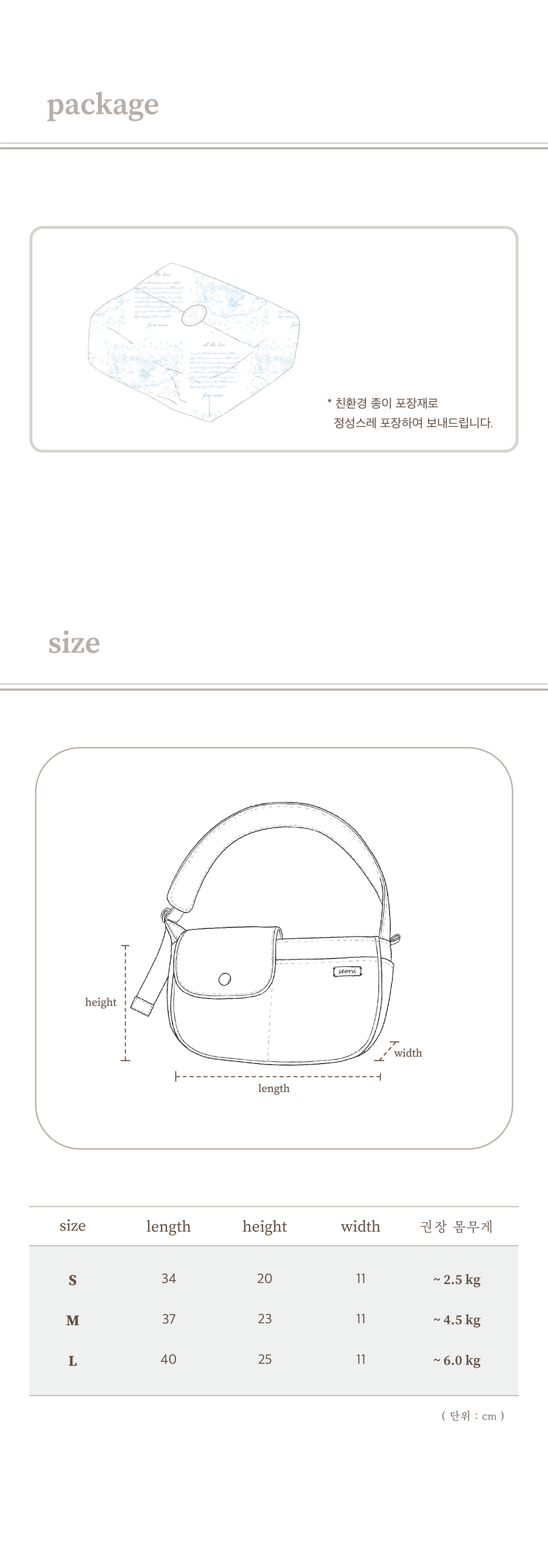 ✔︎ 세트구성 : 슬링백 단품 + 범퍼쿠션 ✔︎ 단품 구매 시 추가되는 금액은, 슬링백 사이즈업 추가 비용입니다. ✔︎서루의 시그니쳐 상품인 헤링본펫백은 앞,뒷면과 어깨끈 부분의 스폰지 보강재 추가로 리뉴얼되었습니다. 리뉴얼로 인해 더욱 탄탄하고 폭신한 사용감을 느끼실 수 있습니다.