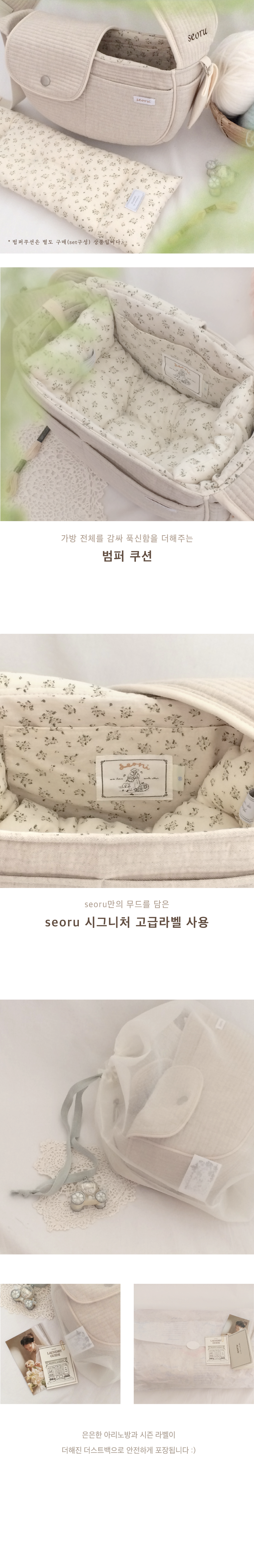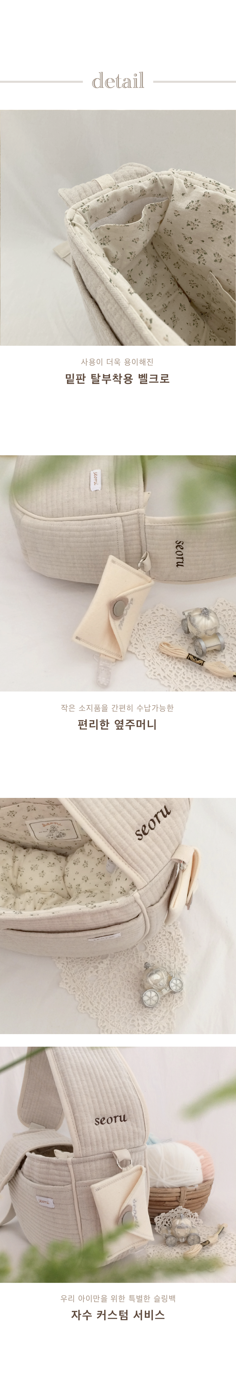 기본에 충실한 미니멀한 쉐입만으로 서루의 무드를 느껴보시고 싶으신 분들에게 추천드리며 3가지 컬러(beige, mocha, yellow)로 다양하게 연출해보실 수 있습니다. 소박하지만 멋스러운 소재들이 조화를 이룬 헤링본 라인과 함께 아이들과의 즐거운 외출 길을 경험해보시길 바라겠습니다.