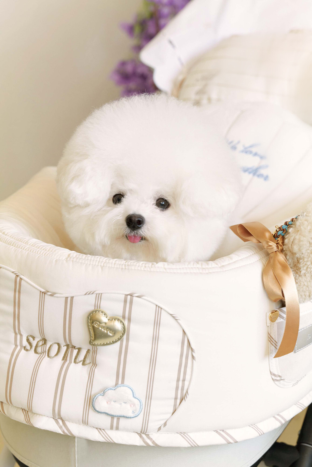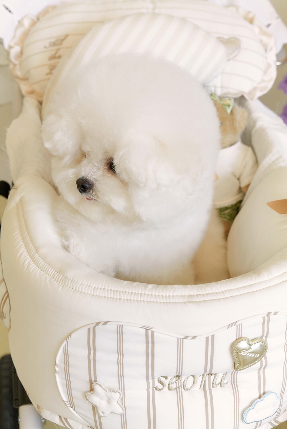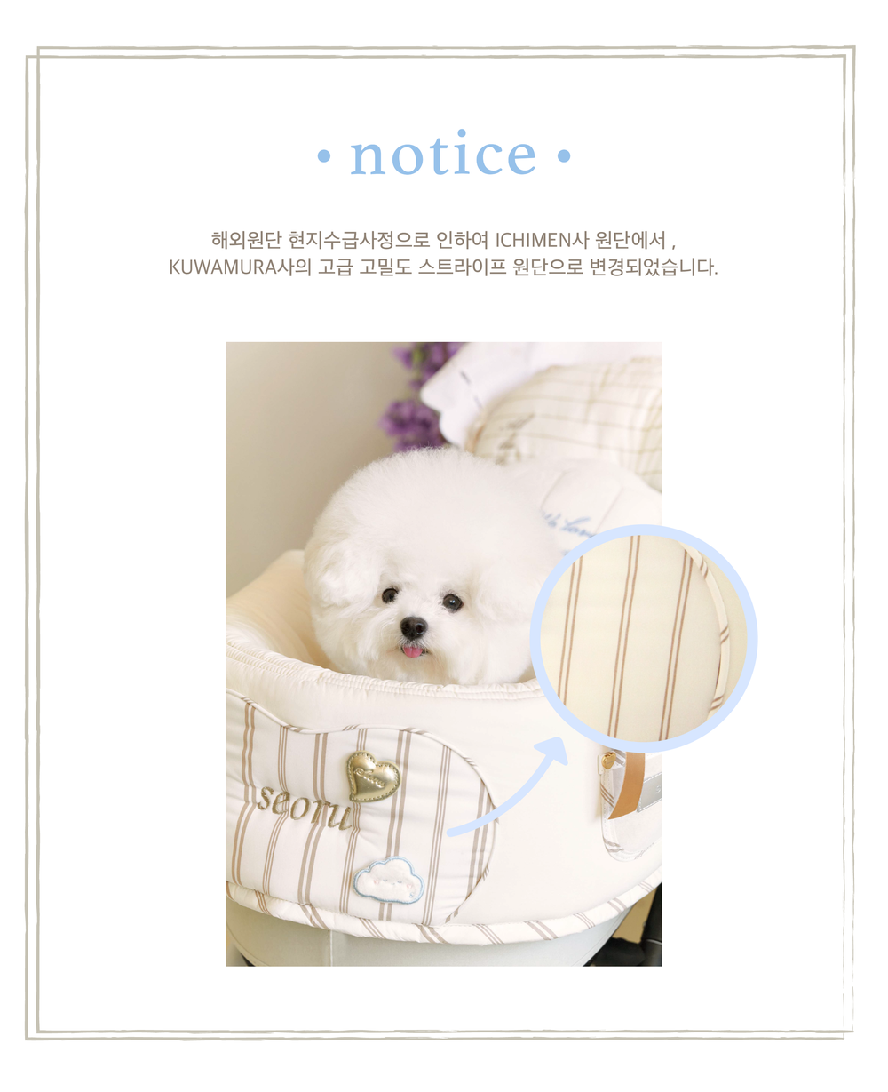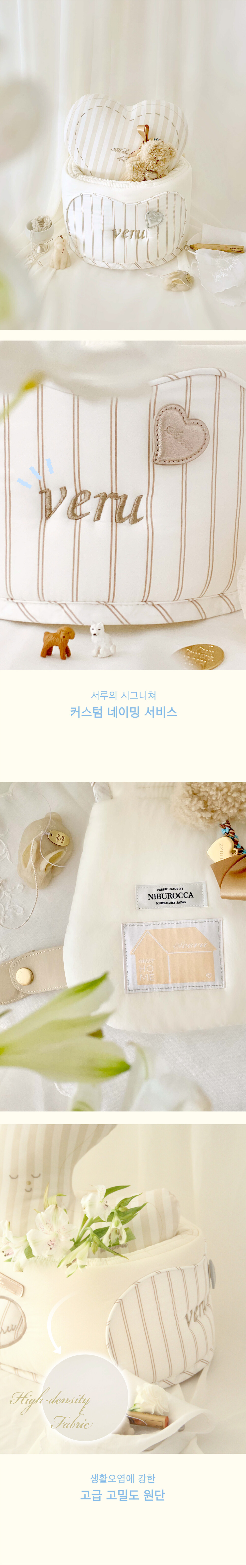 Seoru sweet home! 세심한 수작업으로 완성한 이곳저곳 멋스러운 디테일이 돋보이는, 서루의 하우스 버기 가드(House Buggy Guard)입니다. 서루의 하우스 버기가드는 아이들이 유모차 내부에 머무는 시간이 기분 좋은 외출경험이 될 수 있도록, 몸이 닿는 부분에는 부드러운 촉감을 위한 고밀도 원단을 사용하고, 하트쉐입을 채운 포인트원단에는 KUWAMURA사와 ICHIMEN사의 고급 스트라이프 패브릭을 사용했습니다. 또한 내부에는 여러 번 샘플링을 통해 선택한 보강재를 레이어링 하여 아이들이 오랜 시간 머물기 좋게끔 견고한 만듦새로 완성되었습니다.