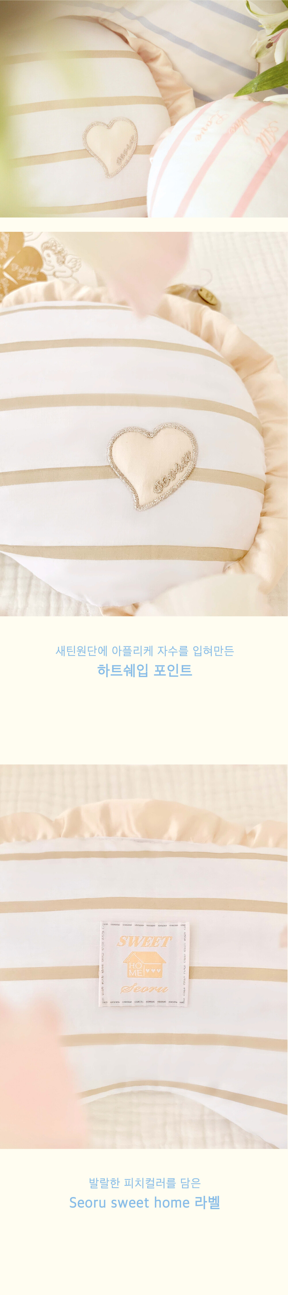 은은하게 반짝이는 새틴 프릴이 사랑스러운 하우스 필로우(House Pillow)입니다. 아이들이 유모차 내부에서 머리를 기대고 쉬거나, 몸을 포개어 사용하는 필로우쿠션으로, 100% 마이크로 화이버의 가볍고 포근한 쿠셔닝을 느끼실 수 있습니다. 또한 아이들 몸이 닿는 것을 고려하여 순면의 스트라이프 원단을 사용하여 부드러운 촉감이 특징입니다. 왼쪽에는 all the love 자수를, 오른쪽에는 새틴원단으로 만든 작은 하트 쿠션조각에 아플리케 자수를 입힌 하트쉐입 포인트를 넣어 장식했습니다. 서루의 하우스 버기가드와 함께 사용하실 수 있는 하우스 필로우는 3가지 색상(Blue, Pink, Beige)으로 출시되었습니다.