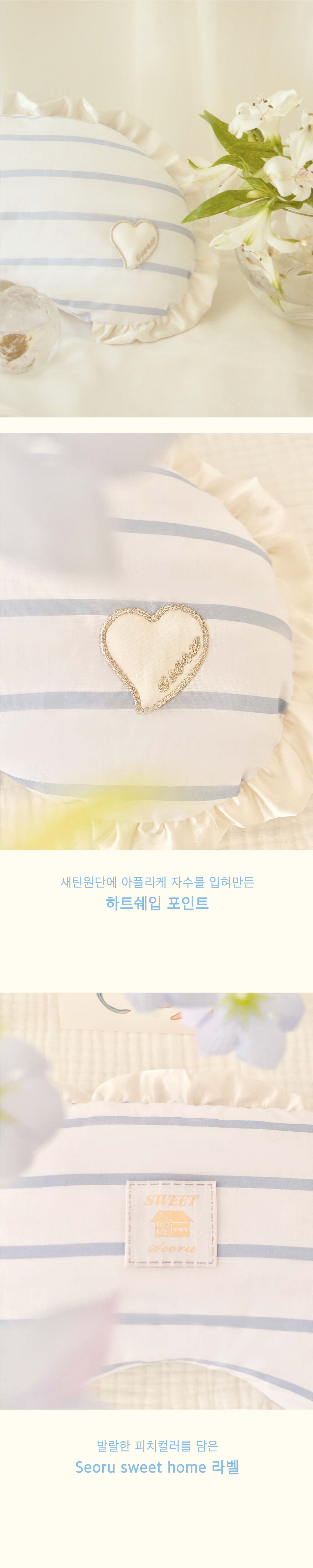 은은하게 반짝이는 새틴 프릴이 사랑스러운 하우스 필로우(House Pillow)입니다. 아이들이 유모차 내부에서 머리를 기대고 쉬거나, 몸을 포개어 사용하는 필로우쿠션으로, 100% 마이크로 화이버의 가볍고 포근한 쿠셔닝을 느끼실 수 있습니다. 또한 아이들 몸이 닿는 것을 고려하여 순면의 스트라이프 원단을 사용하여 부드러운 촉감이 특징입니다. 왼쪽에는 all the love 자수를, 오른쪽에는 새틴원단으로 만든 작은 하트 쿠션조각에 아플리케 자수를 입힌 하트쉐입 포인트를 넣어 장식했습니다. 서루의 하우스 버기가드와 함께 사용하실 수 있는 하우스 필로우는 3가지 색상(Blue, Pink, Beige)으로 출시되었습니다.
