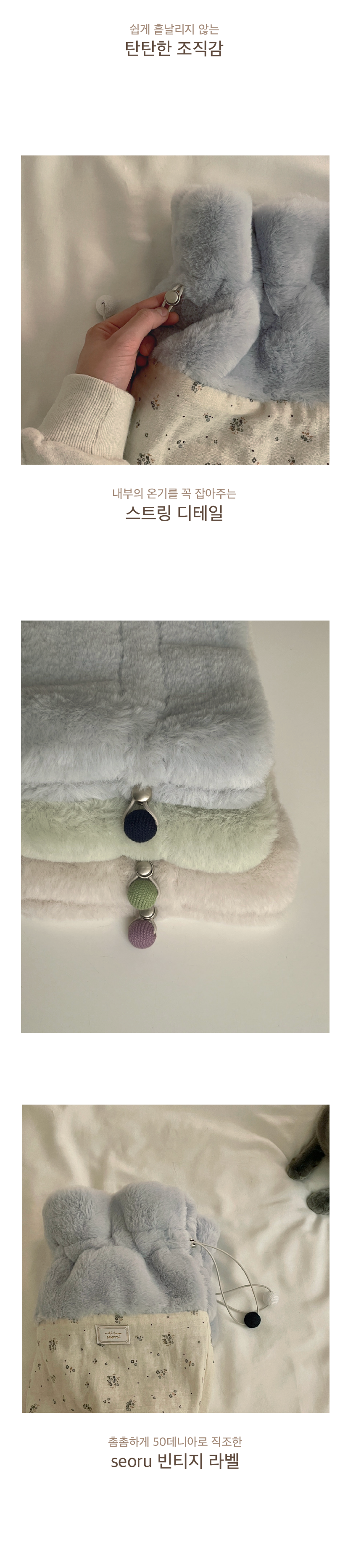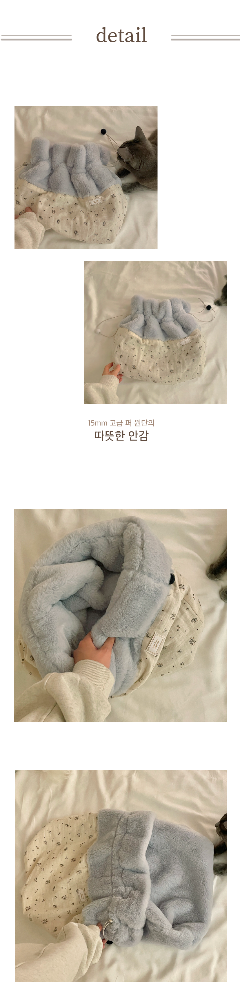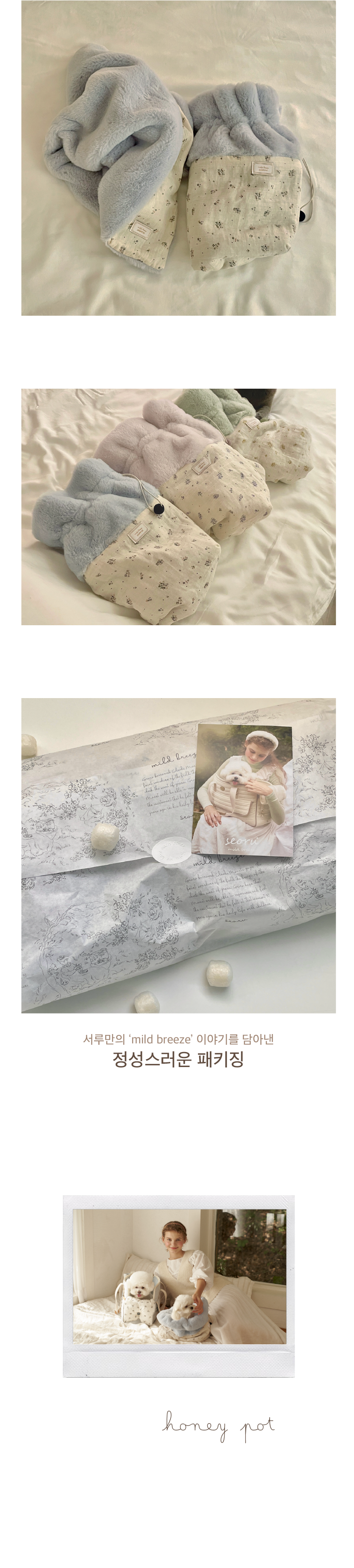 풍성한 15mm의 고급 퍼 원단과, 무명실로 짠 100% 코튼 원단을 사용하여 가벼우면서도 따듯함을 더했습니다. 무미건조한 겨울에 산뜻함을 주는 컬러의 원단을 고르고 두 원단을 꼼꼼하게 봉제해 이음새 부분을 포함한 블랭킷의 모든 부분에서 보송보송하고 보드라운 촉감이 느껴집니다. 스트링 조절 디테일로 따듯한 온기를 보다 오랫동안 내부에 머금을 수 있도록 했으며 스트링 끝 부분에는 작은 나무공에 수작업으로 털실을 돌려가며 붙인 컬러 우드볼로 산뜻한 포인트를 주었습니다. 꿀단지는 슬링백, 발롱백과 같이 사용할 때에 2중으로 아이들을 두텁게 보호해 찬 기운을 막아주며 가방 밖에서도 다양한 상황에 활용 가능합니다.