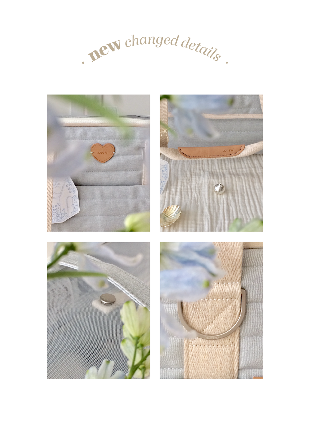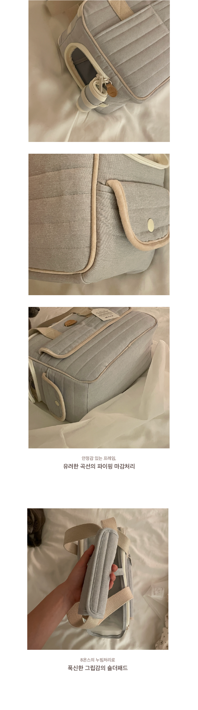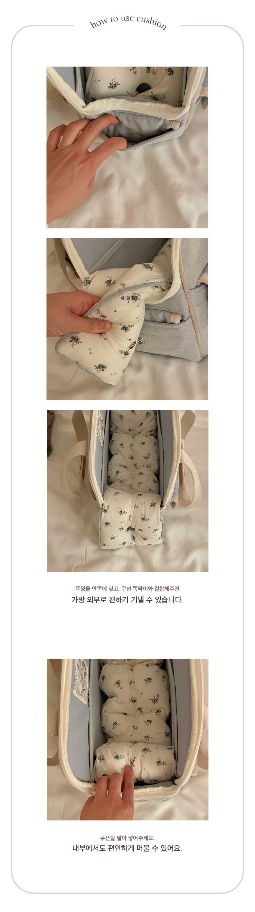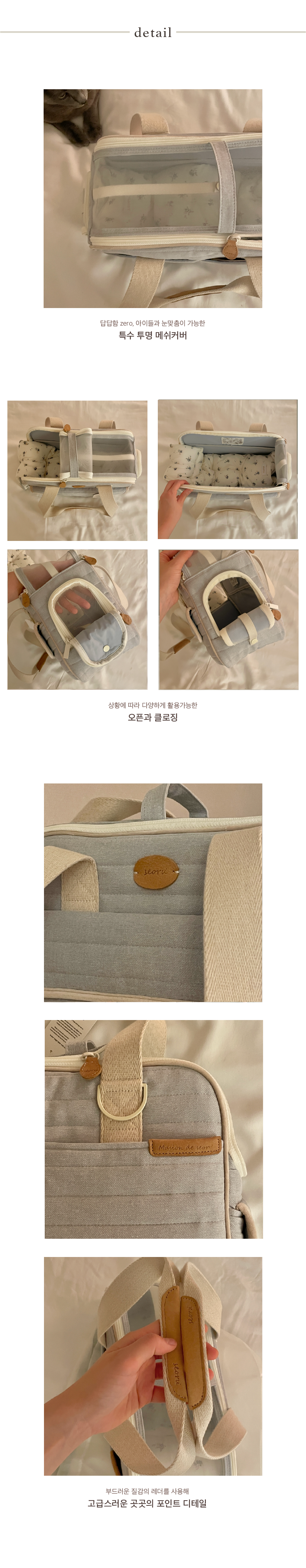 가방의 겉감은 면 100%을 napping 처리한 트윌 원단을 골라 닿았을 때에 부드러운 터치감을 고려했습니다. 4온스의 퐁실한 솜으로 원단을 누빈 후 발수 가공 처리하여 부드러운 텍스쳐를 가졌지만 오염에 상대적으로 강하도록 제작했습니다. 내부 안감은 촘촘한 조직감의 부드러운 안감을 사용하여 아이들이 청결하고 포근하게 쉴 수 있는 분위기를 생각했으며 4면에는 단단하게 각을 잡아 아이들이 안정감을 느끼며 기대 휴식을 취할 수 있는 공간을 마련하고자 했습니다. 벨벳 원단으로 면 심지를 감싸 면과 면의 이음새에 포인트를 주고 가방의 곳곳에 서루의 로고를 음각으로 새겨 넣은 누벅 디테일로 더욱 고급스러운 인상을 더했습니다. 손잡이는 부드럽지만 핏한 그립감을 느낄 수 있도록 완성하였고 손잡이 스트랩은 시중에 나와있는 웨빙 중 가장 최 고급 품질의 것을 사용해 견고하면서도 보드라운 기분을 느끼실 수 있습니다.