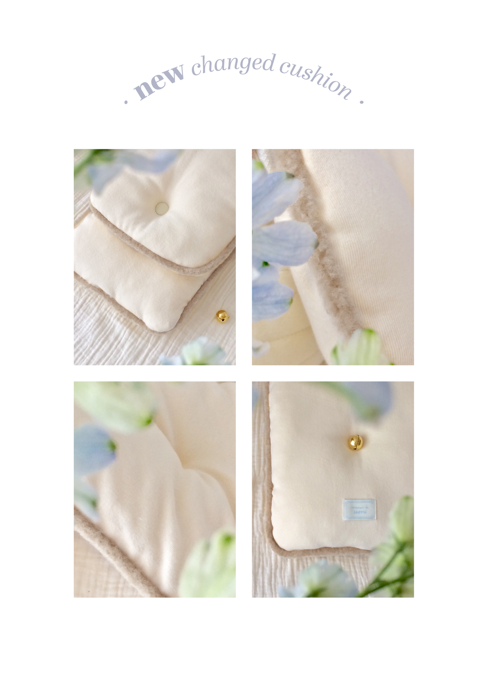 가방의 겉감은 면 100%을 napping 처리한 트윌 원단을 골라 닿았을 때에 부드러운 터치감을 고려했습니다. 4온스의 퐁실한 솜으로 원단을 누빈 후 발수 가공 처리하여 부드러운 텍스쳐를 가졌지만 오염에 상대적으로 강하도록 제작했습니다. 내부 안감은 촘촘한 조직감의 부드러운 안감을 사용하여 아이들이 청결하고 포근하게 쉴 수 있는 분위기를 생각했으며 4면에는 단단하게 각을 잡아 아이들이 안정감을 느끼며 기대 휴식을 취할 수 있는 공간을 마련하고자 했습니다. 벨벳 원단으로 면 심지를 감싸 면과 면의 이음새에 포인트를 주고 가방의 곳곳에 서루의 로고를 음각으로 새겨 넣은 누벅 디테일로 더욱 고급스러운 인상을 더했습니다. 손잡이는 부드럽지만 핏한 그립감을 느낄 수 있도록 완성하였고 손잡이 스트랩은 시중에 나와있는 웨빙 중 가장 최 고급 품질의 것을 사용해 견고하면서도 보드라운 기분을 느끼실 수 있습니다.