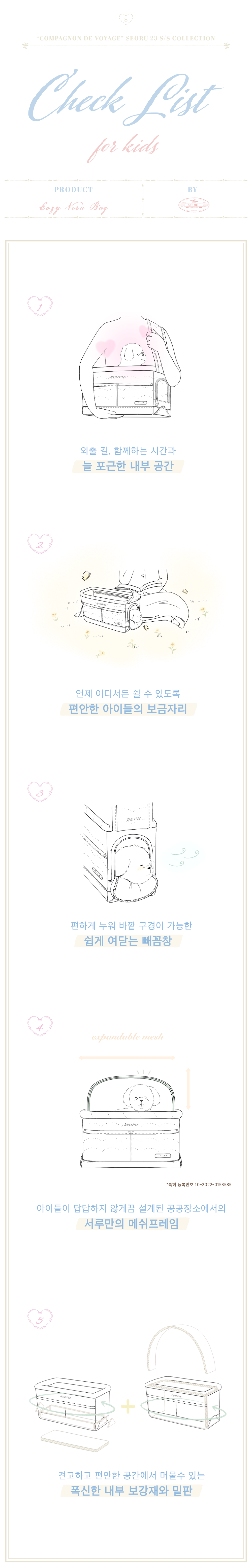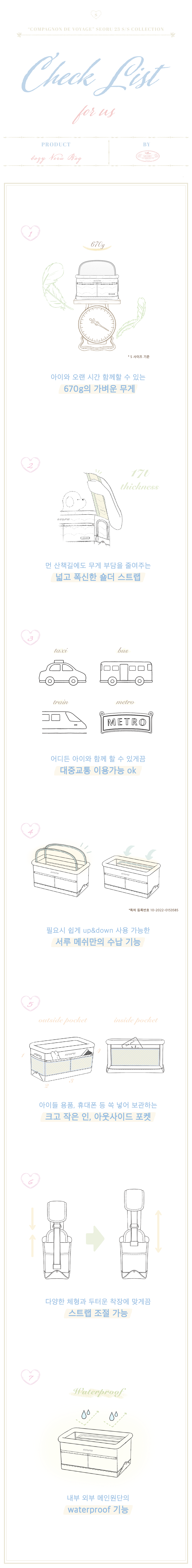 간결한 형태에 톤온톤의 색감이 무척 매력적인 23s/s 시즌 코지 베루백(Cozy veru bag)입니다. 코지 베루백은 장식의 디테일을 절제하여 어떠한 룩에도 조화롭도록 미니멀한 무드로 디자인되었습니다. 또한 코지 베루백은 메인 겉감과 내부원단에 바스락거리는 촘촘한 짜임의 방수원단을 사용하여 아이들이 시원한 촉감을 느끼고 오염으로부터 관리가 더욱 용이하게끔 제작되었습니다.