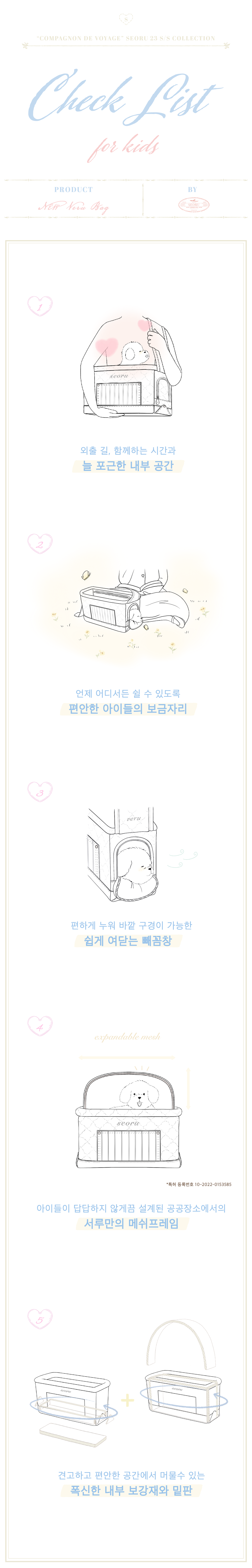 23s/s시즌 더욱 화사하고 매력적인 색감으로 출시된 새로운 베루백(veru bag)을 소개합니다. 봄과 산뜻한 산책에 어울리는 컬러감으로 돌아온 베루백은 아이들과 함께하는 길고 짧은 여행에 적합할 수 있도록 제작되었습니다. 안온함을 느끼며 쉴 수 있는 내부 공간과 산들바람을 즐기는 빼꼼창, 언제 어디서나 아이들과 함께할 수 있도록 견고한 파이핑&메쉬 프레임으로 만든 보다 넉넉한 공간감이 특징이며, 보호자분들을 위한 두툼한 숄더 스트랩과 단단한 밑판을 통한 무게 분산으로 오랜 시간 아이들과 함께하는 산책길도 부담스럽지 않아 좋습니다. 또한 내부 안감에는 부드러운 텍스쳐감이 느껴지지만 방수기능이 있는 원단을 사용해 오염을 비교적 쉽게 제거할 수 있어 좋습니다.